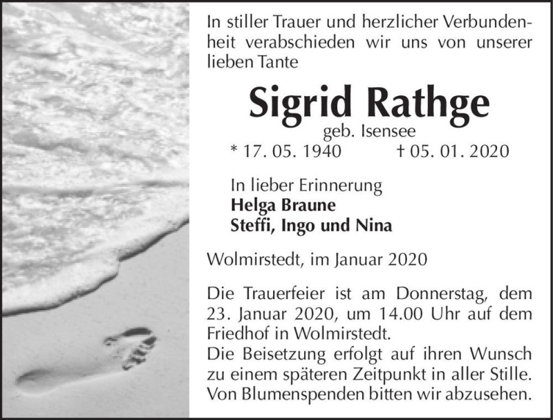 Hier finden Sie alle Traueranzeigen aus der Zeitung, die bisher für Sigrid Rathge (geb. Isensee) erschienen sind. Weitere Traueranzeigen, die in der Zeitung erscheinen, werden hier ebenfalls aufgelistet