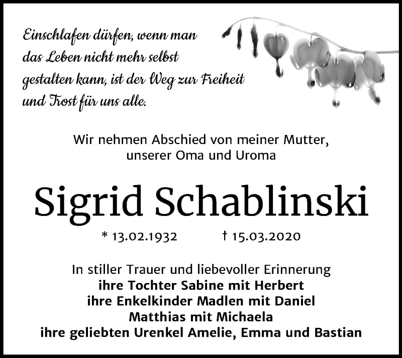Hier finden Sie alle Traueranzeigen aus der Zeitung, die bisher für Sigrid Schablinski erschienen sind. Weitere Traueranzeigen, die in der Zeitung erscheinen, werden hier ebenfalls aufgelistet