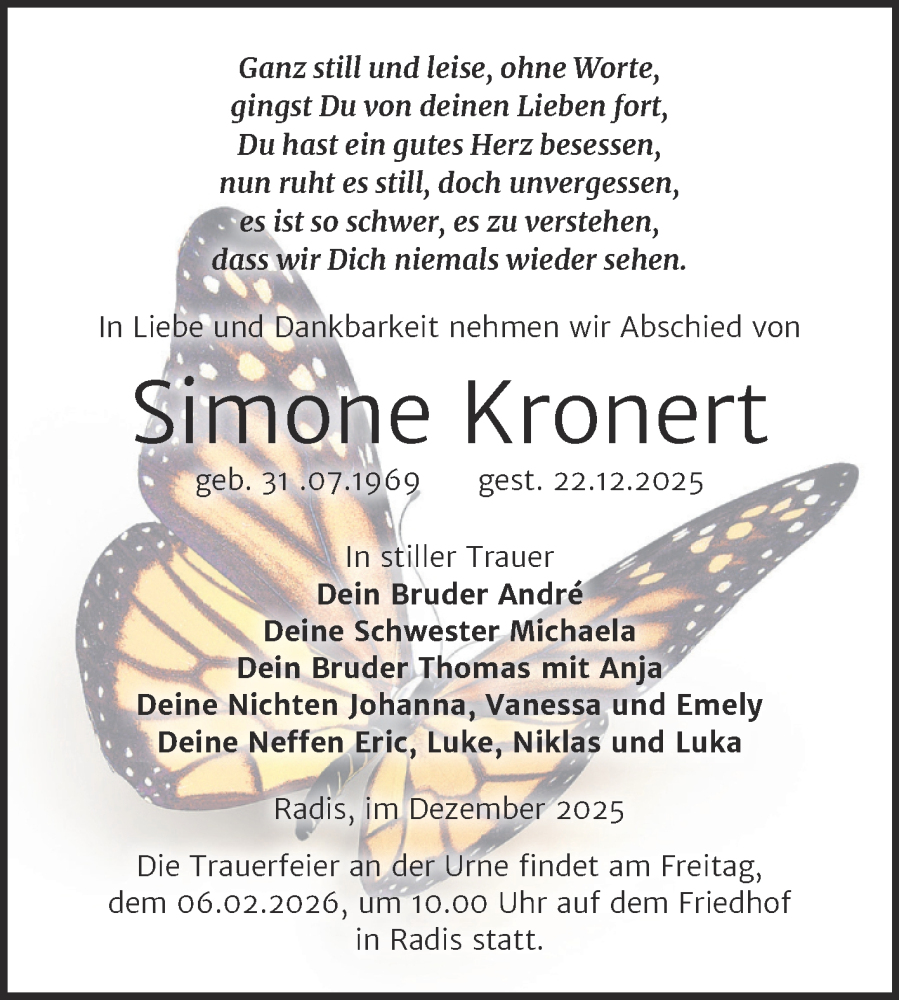 Hier finden Sie alle Traueranzeigen aus der Zeitung, die bisher für Simone Kronert erschienen sind. Weitere Traueranzeigen, die in der Zeitung erscheinen, werden hier ebenfalls aufgelistet