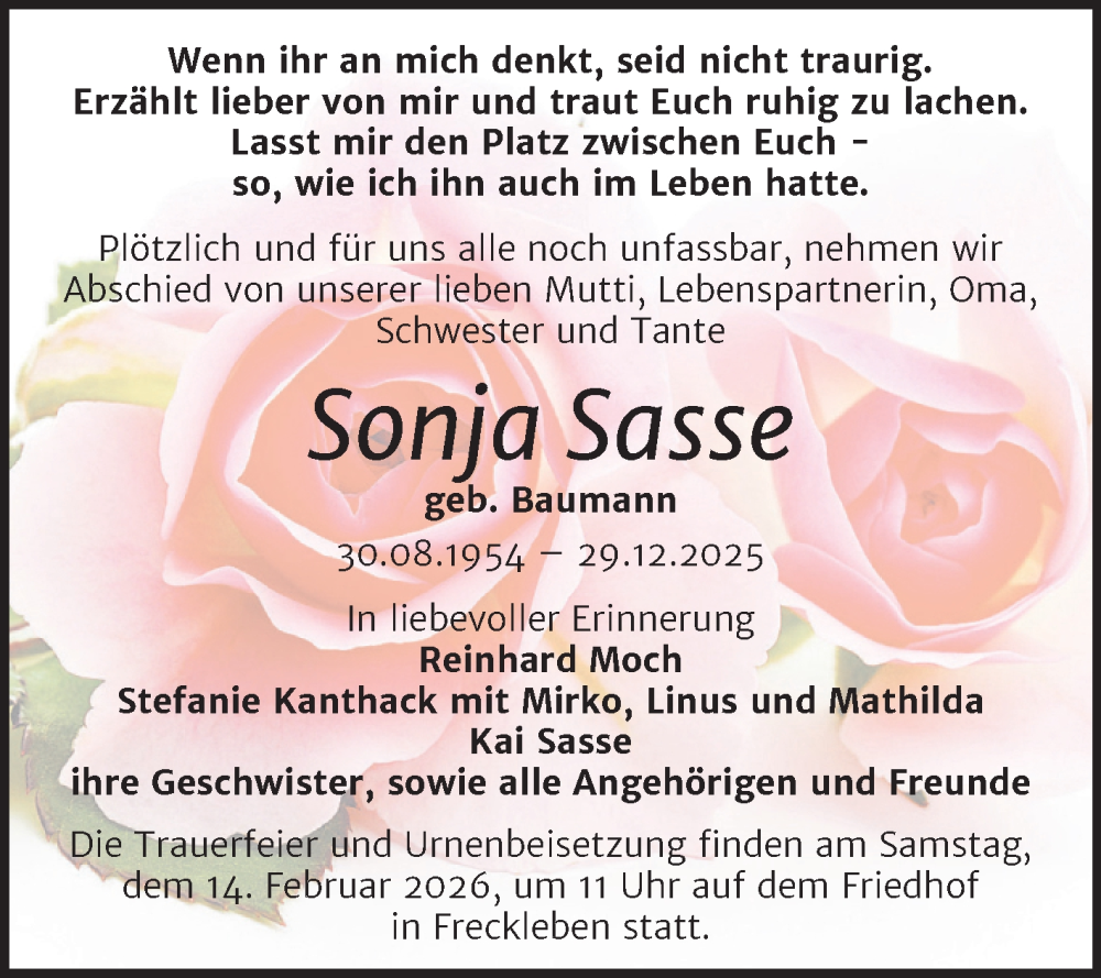Hier finden Sie alle Traueranzeigen aus der Zeitung, die bisher für Sonja Sasse erschienen sind. Weitere Traueranzeigen, die in der Zeitung erscheinen, werden hier ebenfalls aufgelistet