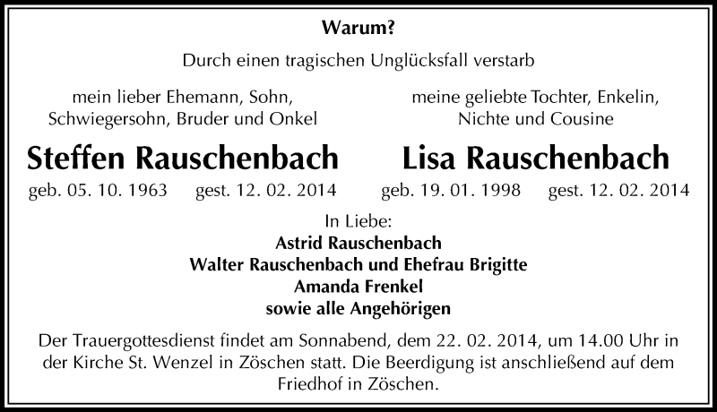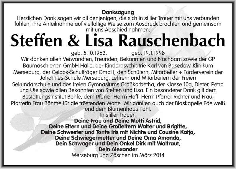Hier finden Sie alle Traueranzeigen aus der Zeitung, die bisher für Steffen und Lisa Rauschenbach erschienen sind. Weitere Traueranzeigen, die in der Zeitung erscheinen, werden hier ebenfalls aufgelistet