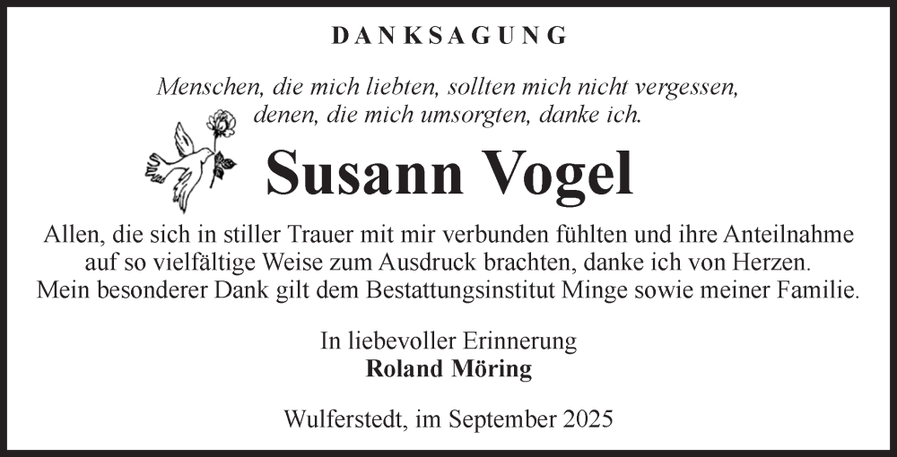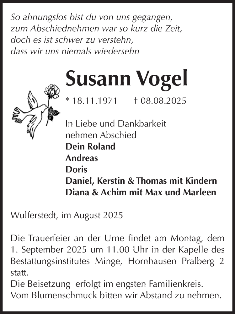Hier finden Sie alle Traueranzeigen aus der Zeitung, die bisher für Susann Vogel erschienen sind. Weitere Traueranzeigen, die in der Zeitung erscheinen, werden hier ebenfalls aufgelistet