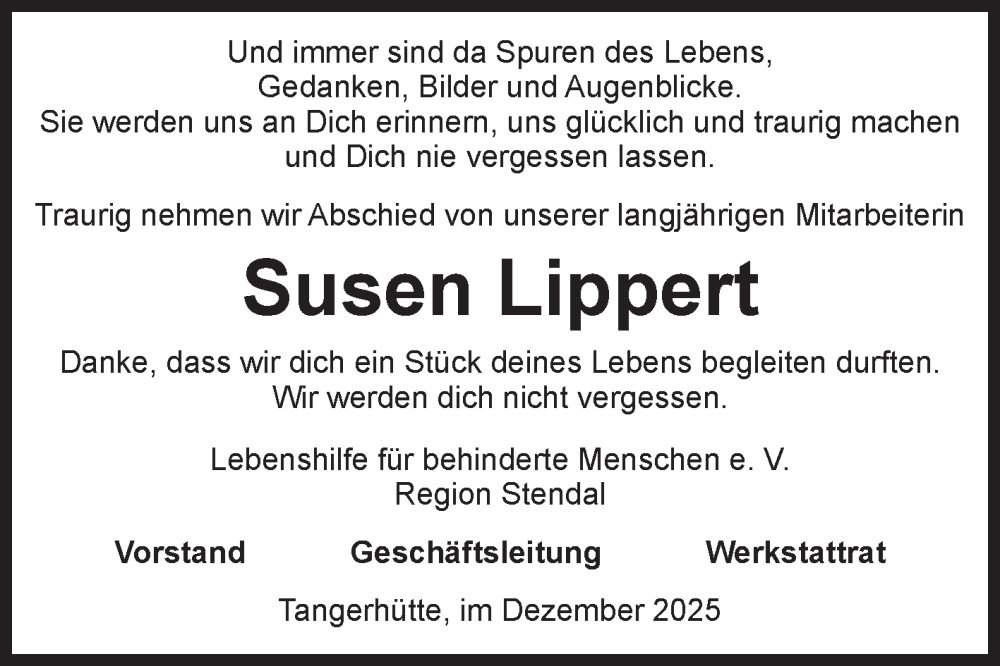 Hier finden Sie alle Traueranzeigen aus der Zeitung, die bisher für Susen Lippert erschienen sind. Weitere Traueranzeigen, die in der Zeitung erscheinen, werden hier ebenfalls aufgelistet