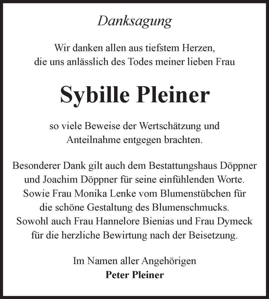 Hier finden Sie alle Traueranzeigen aus der Zeitung, die bisher für Sybille Pleiner erschienen sind. Weitere Traueranzeigen, die in der Zeitung erscheinen, werden hier ebenfalls aufgelistet