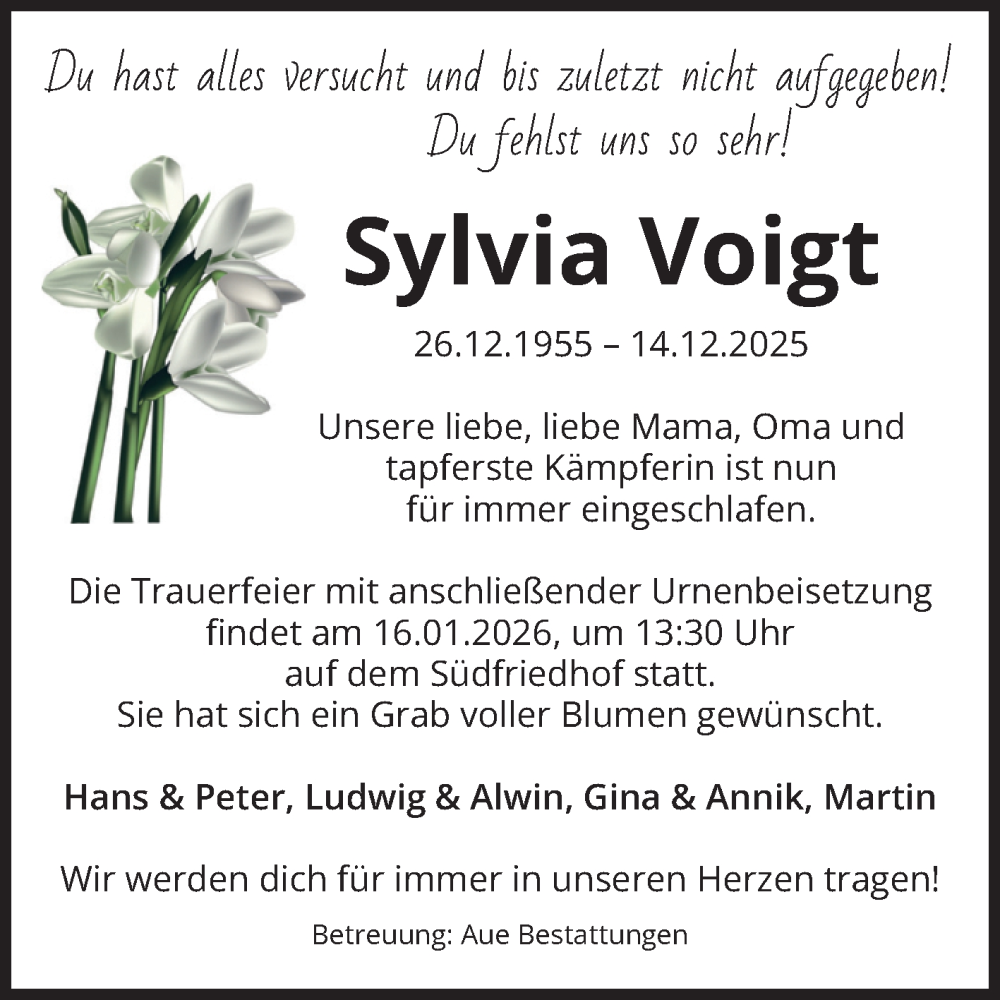Hier finden Sie alle Traueranzeigen aus der Zeitung, die bisher für Sylvia Voigt erschienen sind. Weitere Traueranzeigen, die in der Zeitung erscheinen, werden hier ebenfalls aufgelistet