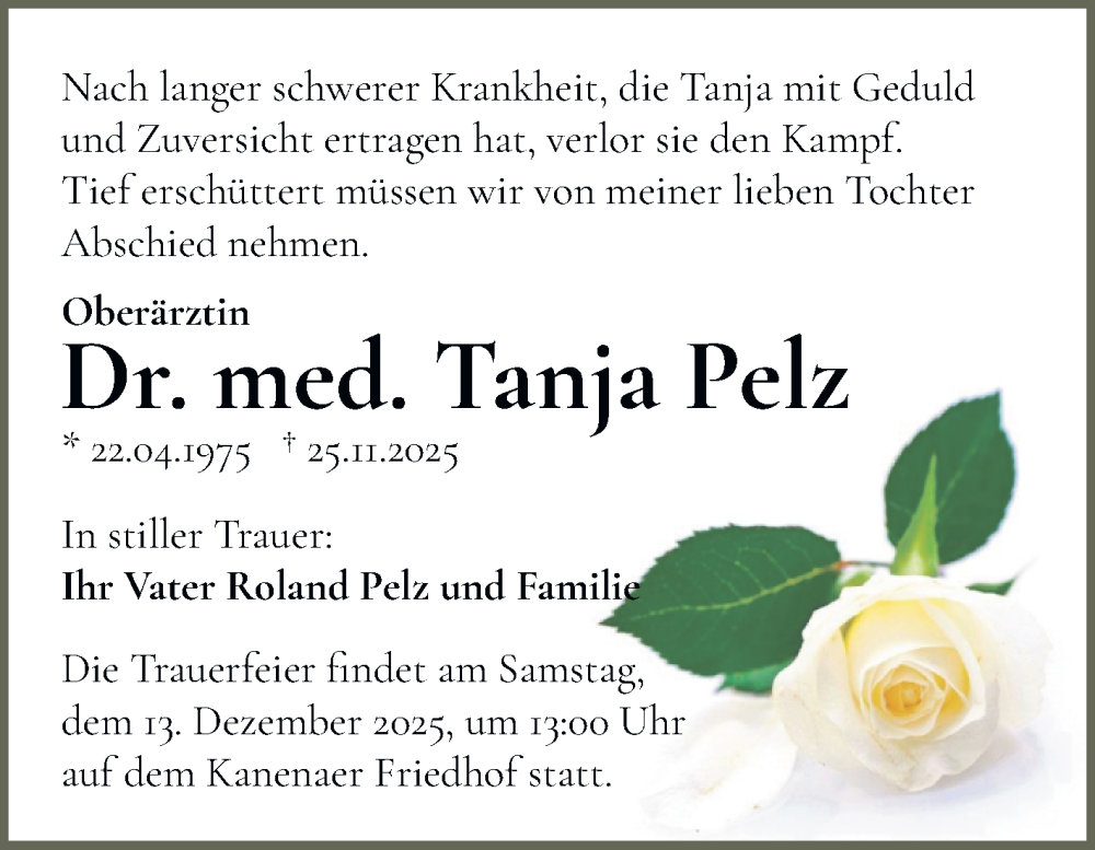 Hier finden Sie alle Traueranzeigen aus der Zeitung, die bisher für Tanja Pelz erschienen sind. Weitere Traueranzeigen, die in der Zeitung erscheinen, werden hier ebenfalls aufgelistet