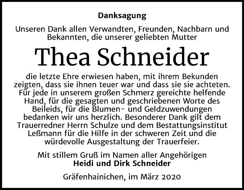 Hier finden Sie alle Traueranzeigen aus der Zeitung, die bisher für Thea Schneider erschienen sind. Weitere Traueranzeigen, die in der Zeitung erscheinen, werden hier ebenfalls aufgelistet