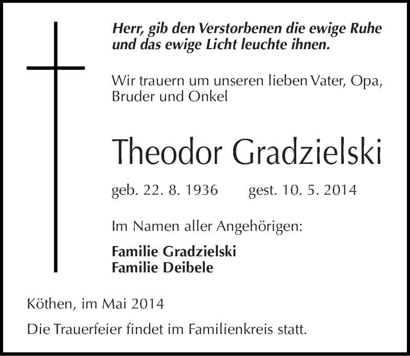 Hier finden Sie alle Traueranzeigen aus der Zeitung, die bisher für Theodor Gradzielski erschienen sind. Weitere Traueranzeigen, die in der Zeitung erscheinen, werden hier ebenfalls aufgelistet