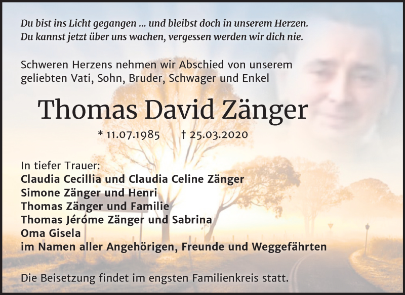 Hier finden Sie alle Traueranzeigen aus der Zeitung, die bisher für Thomas David Zänger erschienen sind. Weitere Traueranzeigen, die in der Zeitung erscheinen, werden hier ebenfalls aufgelistet