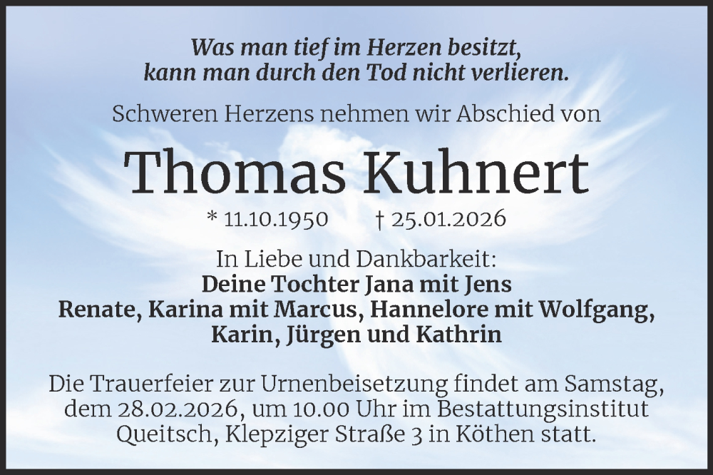 Hier finden Sie alle Traueranzeigen aus der Zeitung, die bisher für Thomas Kuhnert erschienen sind. Weitere Traueranzeigen, die in der Zeitung erscheinen, werden hier ebenfalls aufgelistet