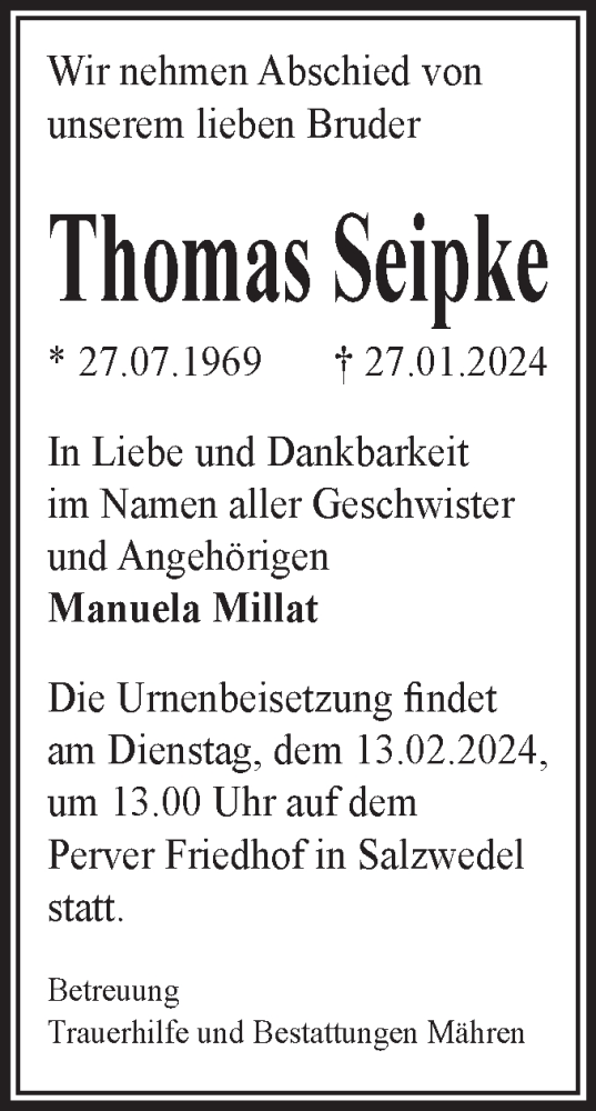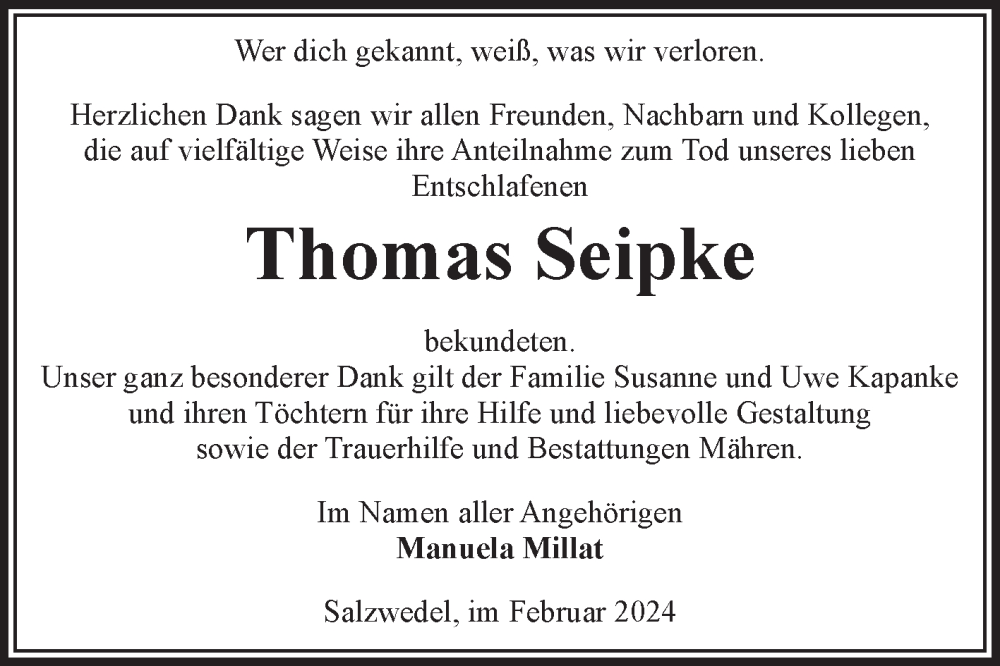 Hier finden Sie alle Traueranzeigen aus der Zeitung, die bisher für Thomas Seipke erschienen sind. Weitere Traueranzeigen, die in der Zeitung erscheinen, werden hier ebenfalls aufgelistet