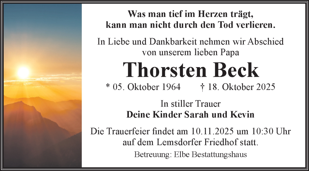 Hier finden Sie alle Traueranzeigen aus der Zeitung, die bisher für Thorsten Beck erschienen sind. Weitere Traueranzeigen, die in der Zeitung erscheinen, werden hier ebenfalls aufgelistet