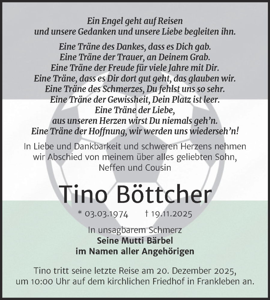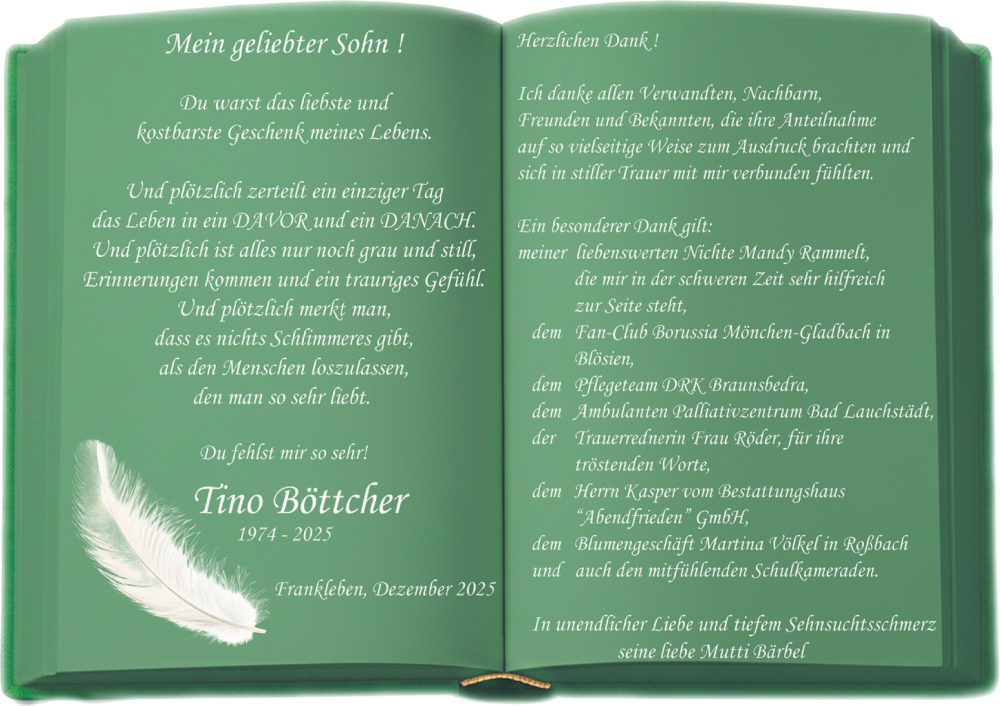 Hier finden Sie alle Traueranzeigen aus der Zeitung, die bisher für Tino Böttcher erschienen sind. Weitere Traueranzeigen, die in der Zeitung erscheinen, werden hier ebenfalls aufgelistet