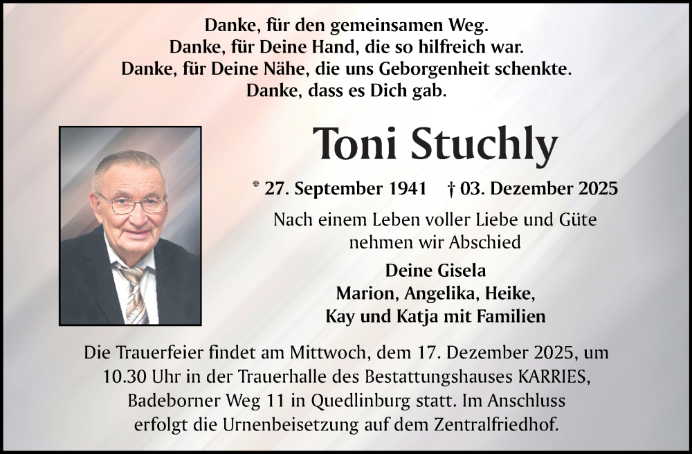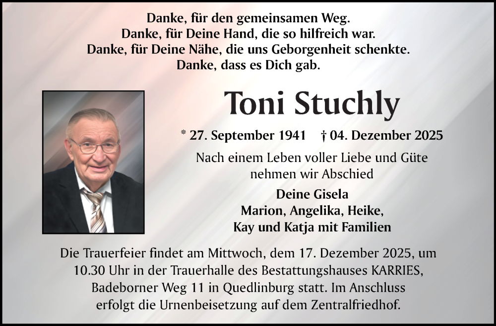 Hier finden Sie alle Traueranzeigen aus der Zeitung, die bisher für Toni Stuchly erschienen sind. Weitere Traueranzeigen, die in der Zeitung erscheinen, werden hier ebenfalls aufgelistet