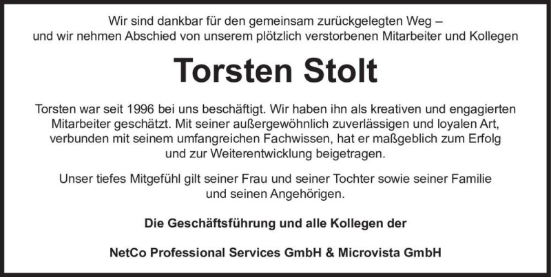 Hier finden Sie alle Traueranzeigen aus der Zeitung, die bisher für Torsten Stolt erschienen sind. Weitere Traueranzeigen, die in der Zeitung erscheinen, werden hier ebenfalls aufgelistet