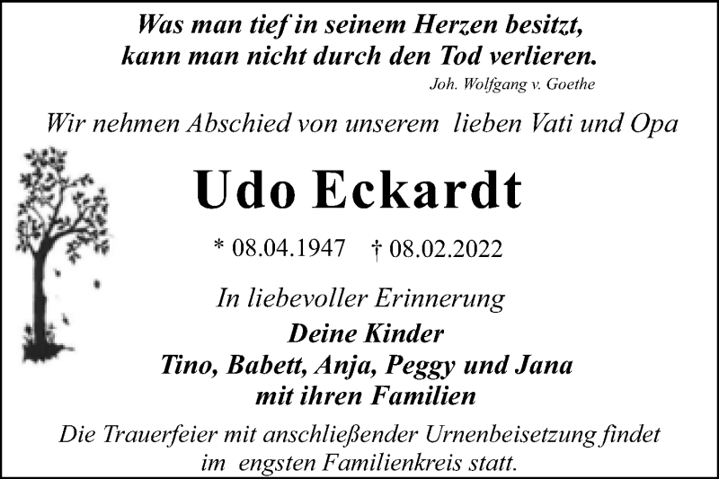 Hier finden Sie alle Traueranzeigen aus der Zeitung, die bisher für Udo Eckardt erschienen sind. Weitere Traueranzeigen, die in der Zeitung erscheinen, werden hier ebenfalls aufgelistet