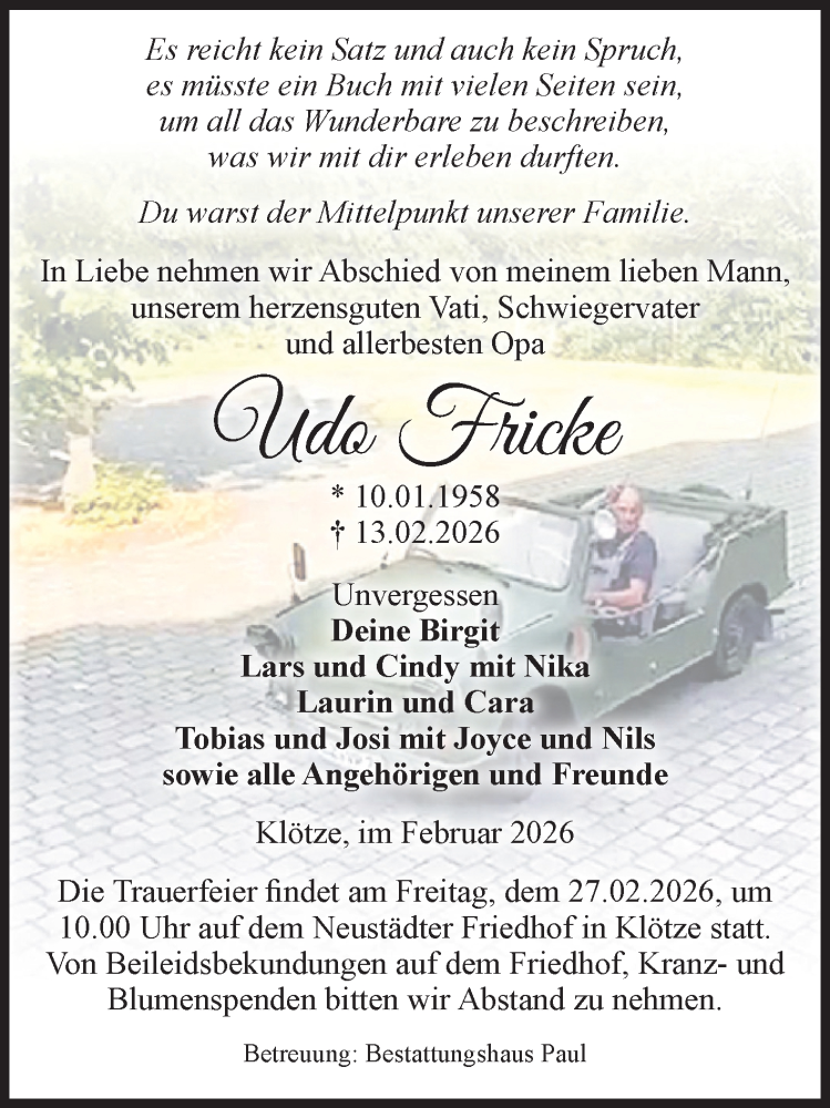 Hier finden Sie alle Traueranzeigen aus der Zeitung, die bisher für Udo Fricke erschienen sind. Weitere Traueranzeigen, die in der Zeitung erscheinen, werden hier ebenfalls aufgelistet