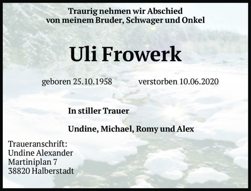 Hier finden Sie alle Traueranzeigen aus der Zeitung, die bisher für Uli Frowerk erschienen sind. Weitere Traueranzeigen, die in der Zeitung erscheinen, werden hier ebenfalls aufgelistet