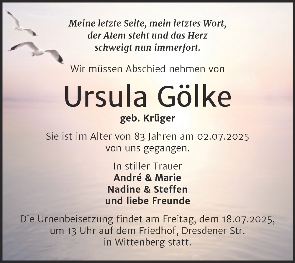 Hier finden Sie alle Traueranzeigen aus der Zeitung, die bisher für Ursula Gölke erschienen sind. Weitere Traueranzeigen, die in der Zeitung erscheinen, werden hier ebenfalls aufgelistet