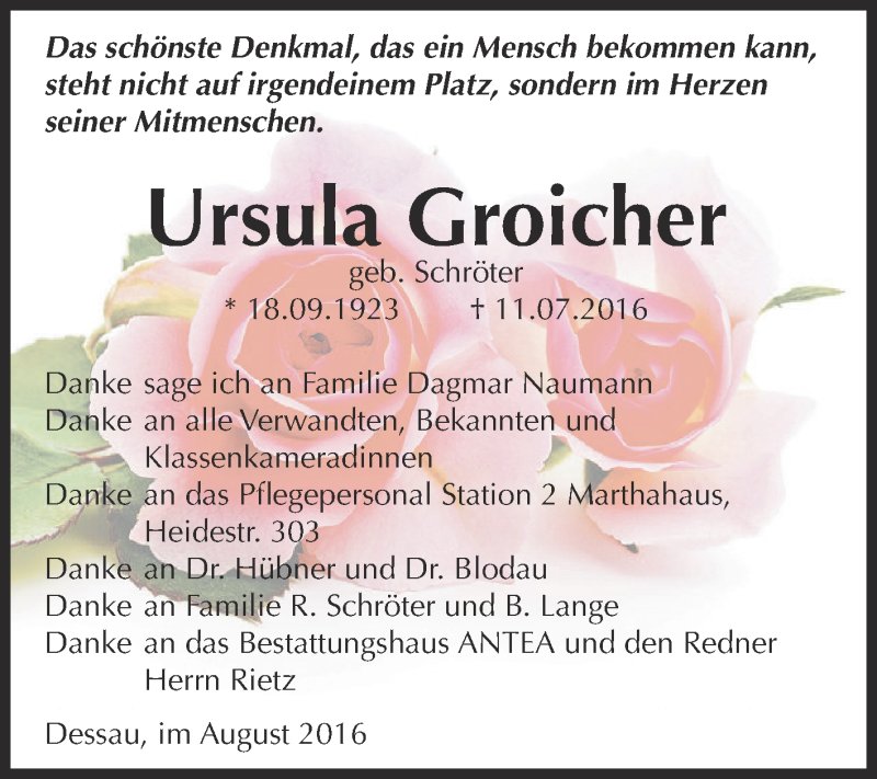 Hier finden Sie alle Traueranzeigen aus der Zeitung, die bisher für Ursula Groicher erschienen sind. Weitere Traueranzeigen, die in der Zeitung erscheinen, werden hier ebenfalls aufgelistet
