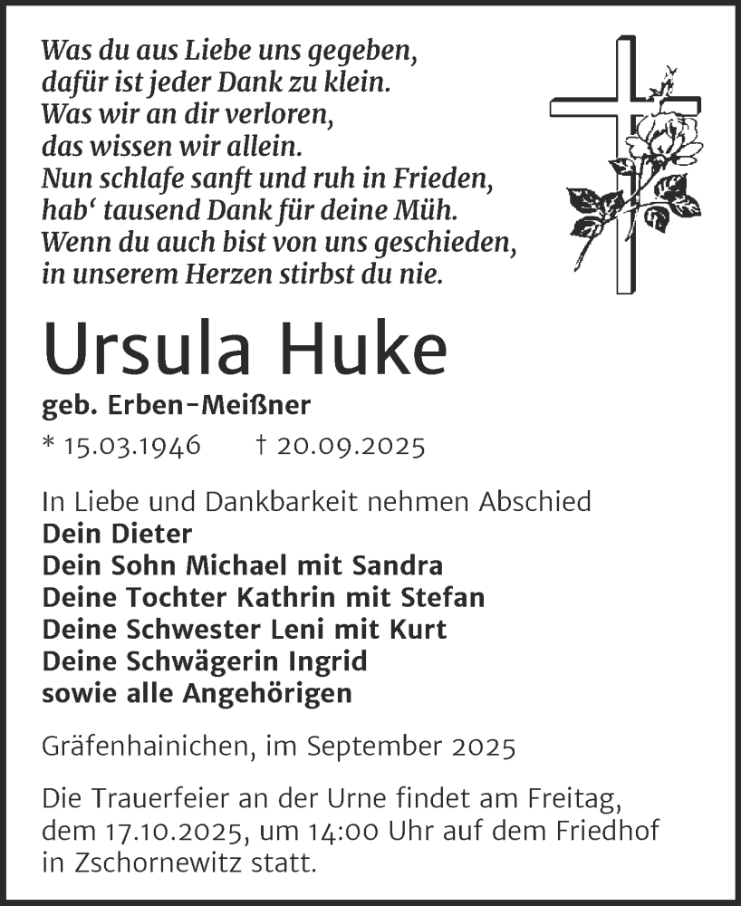 Hier finden Sie alle Traueranzeigen aus der Zeitung, die bisher für Ursula Huke erschienen sind. Weitere Traueranzeigen, die in der Zeitung erscheinen, werden hier ebenfalls aufgelistet