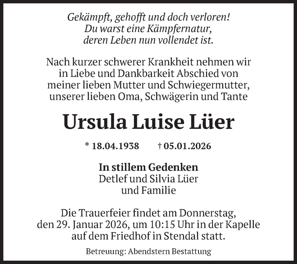 Hier finden Sie alle Traueranzeigen aus der Zeitung, die bisher für Ursula Luise Lüer erschienen sind. Weitere Traueranzeigen, die in der Zeitung erscheinen, werden hier ebenfalls aufgelistet