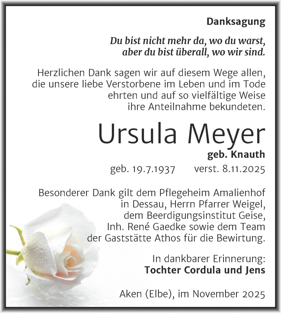 Hier finden Sie alle Traueranzeigen aus der Zeitung, die bisher für Ursula Meyer erschienen sind. Weitere Traueranzeigen, die in der Zeitung erscheinen, werden hier ebenfalls aufgelistet