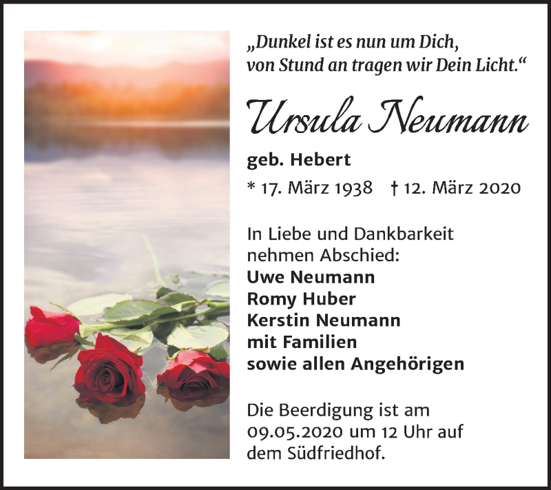 Hier finden Sie alle Traueranzeigen aus der Zeitung, die bisher für Ursula Neumann erschienen sind. Weitere Traueranzeigen, die in der Zeitung erscheinen, werden hier ebenfalls aufgelistet