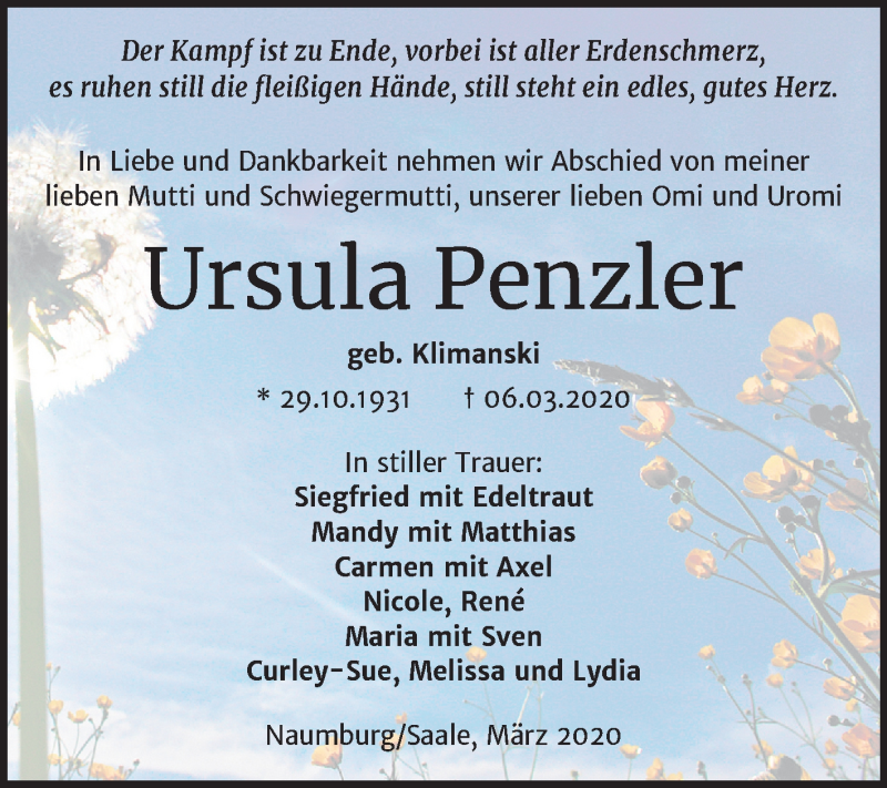 Hier finden Sie alle Traueranzeigen aus der Zeitung, die bisher für Ursula Penzler erschienen sind. Weitere Traueranzeigen, die in der Zeitung erscheinen, werden hier ebenfalls aufgelistet