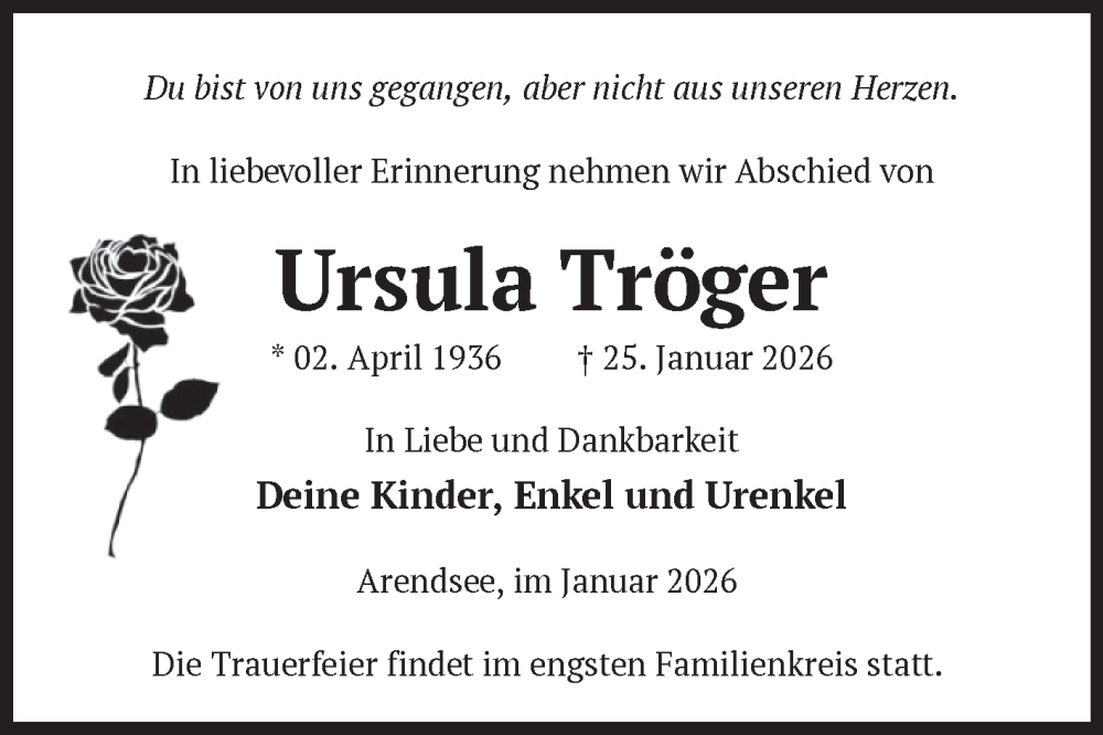 Hier finden Sie alle Traueranzeigen aus der Zeitung, die bisher für Ursula Tröger erschienen sind. Weitere Traueranzeigen, die in der Zeitung erscheinen, werden hier ebenfalls aufgelistet