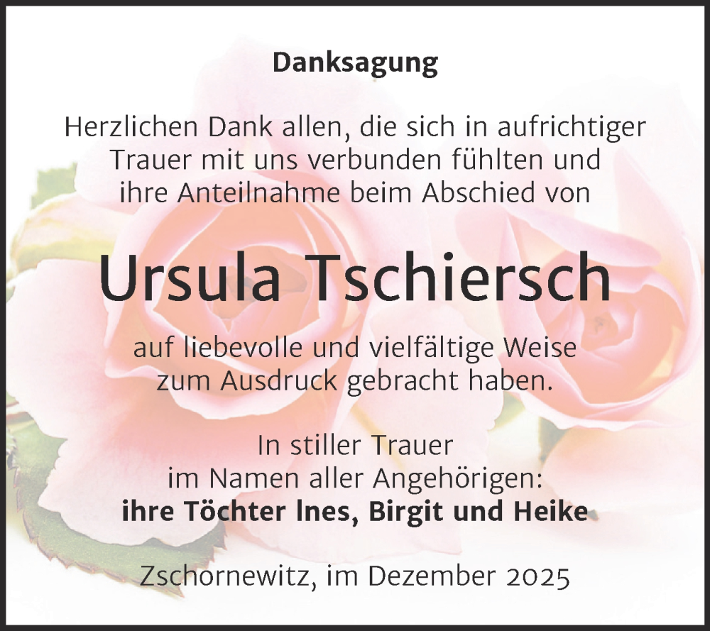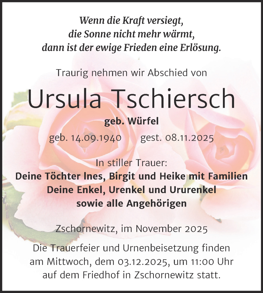 Hier finden Sie alle Traueranzeigen aus der Zeitung, die bisher für Ursula Tschiersch erschienen sind. Weitere Traueranzeigen, die in der Zeitung erscheinen, werden hier ebenfalls aufgelistet