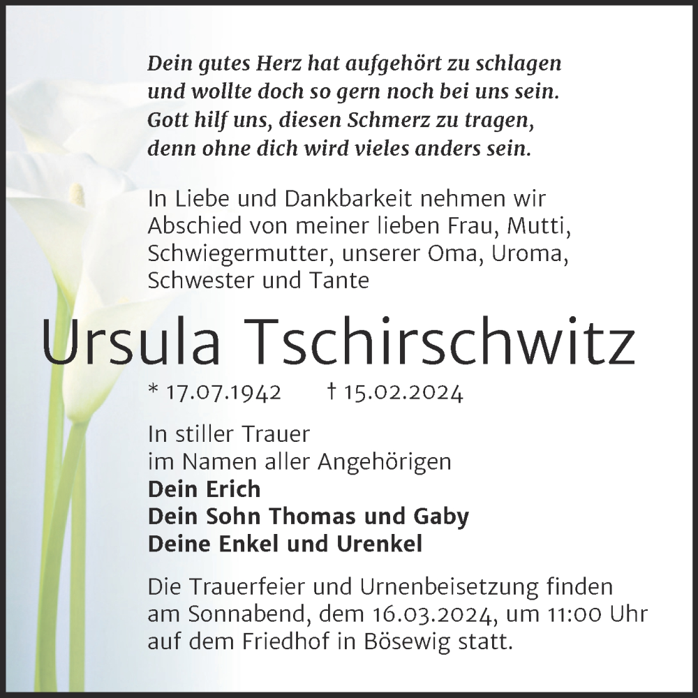 Hier finden Sie alle Traueranzeigen aus der Zeitung, die bisher für Ursula Tschirschwitz erschienen sind. Weitere Traueranzeigen, die in der Zeitung erscheinen, werden hier ebenfalls aufgelistet