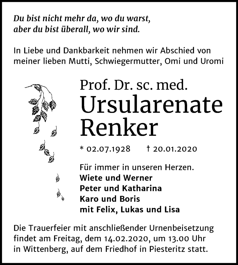 Hier finden Sie alle Traueranzeigen aus der Zeitung, die bisher für Ursularenate Renker erschienen sind. Weitere Traueranzeigen, die in der Zeitung erscheinen, werden hier ebenfalls aufgelistet