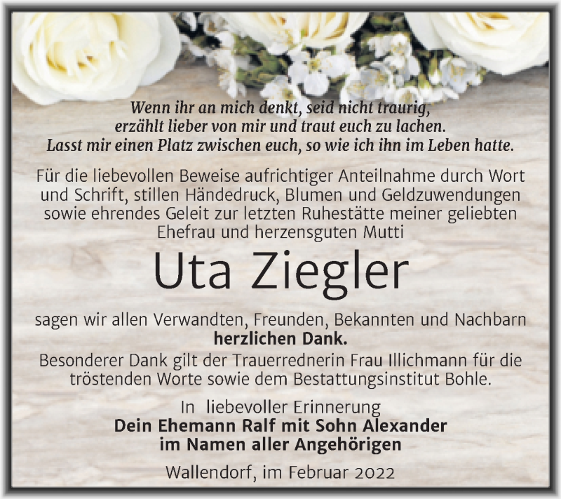 Hier finden Sie alle Traueranzeigen aus der Zeitung, die bisher für Uta Ziegler erschienen sind. Weitere Traueranzeigen, die in der Zeitung erscheinen, werden hier ebenfalls aufgelistet