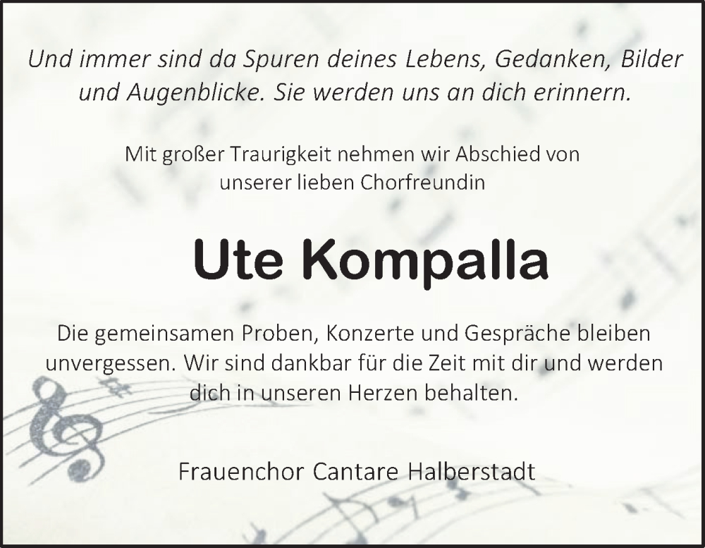 Hier finden Sie alle Traueranzeigen aus der Zeitung, die bisher für Ute Kompalla erschienen sind. Weitere Traueranzeigen, die in der Zeitung erscheinen, werden hier ebenfalls aufgelistet