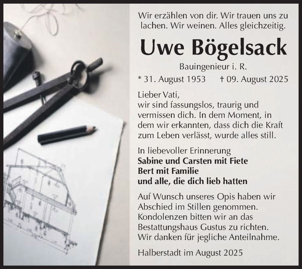 Hier finden Sie alle Traueranzeigen aus der Zeitung, die bisher für Uwe Bögelsack erschienen sind. Weitere Traueranzeigen, die in der Zeitung erscheinen, werden hier ebenfalls aufgelistet