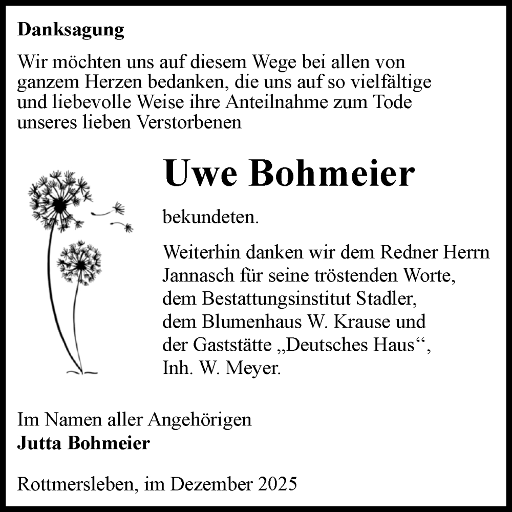 Hier finden Sie alle Traueranzeigen aus der Zeitung, die bisher für Uwe Bohmeier erschienen sind. Weitere Traueranzeigen, die in der Zeitung erscheinen, werden hier ebenfalls aufgelistet