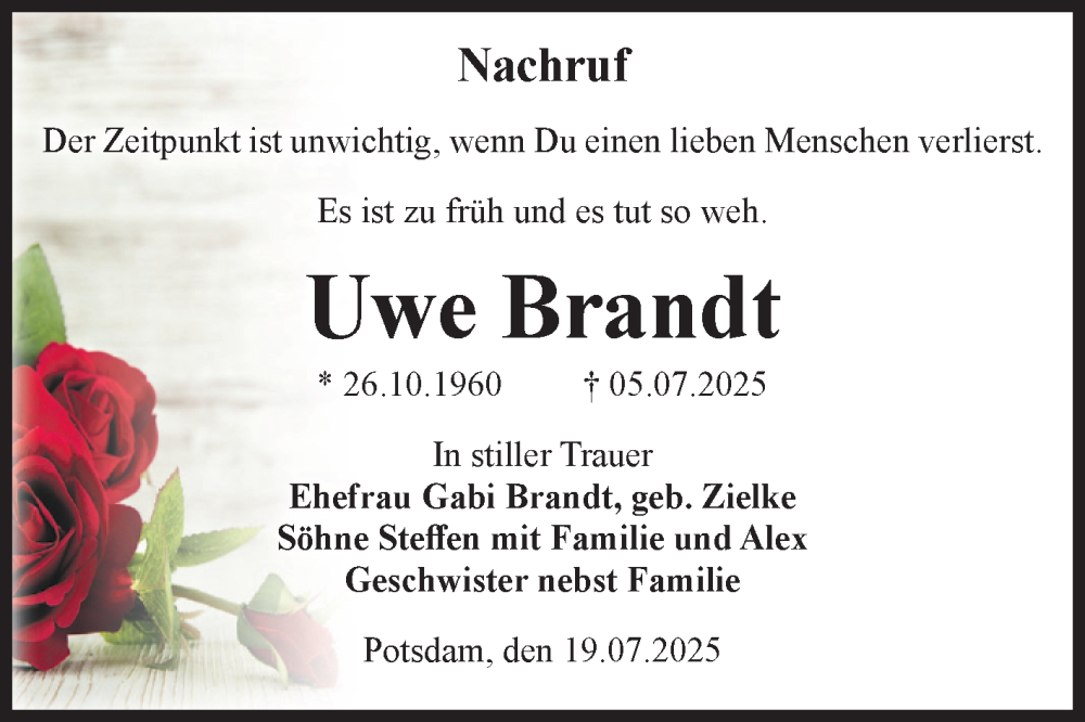 Hier finden Sie alle Traueranzeigen aus der Zeitung, die bisher für Uwe Brandt erschienen sind. Weitere Traueranzeigen, die in der Zeitung erscheinen, werden hier ebenfalls aufgelistet