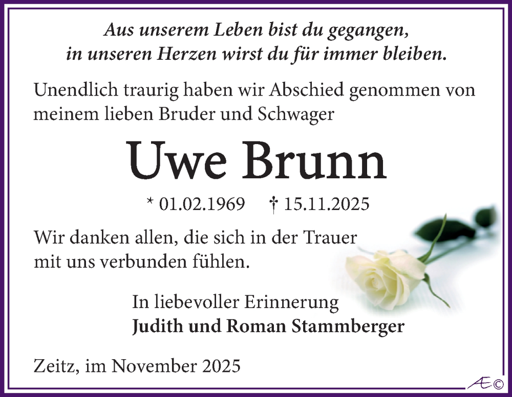Hier finden Sie alle Traueranzeigen aus der Zeitung, die bisher für Uwe Brunn erschienen sind. Weitere Traueranzeigen, die in der Zeitung erscheinen, werden hier ebenfalls aufgelistet