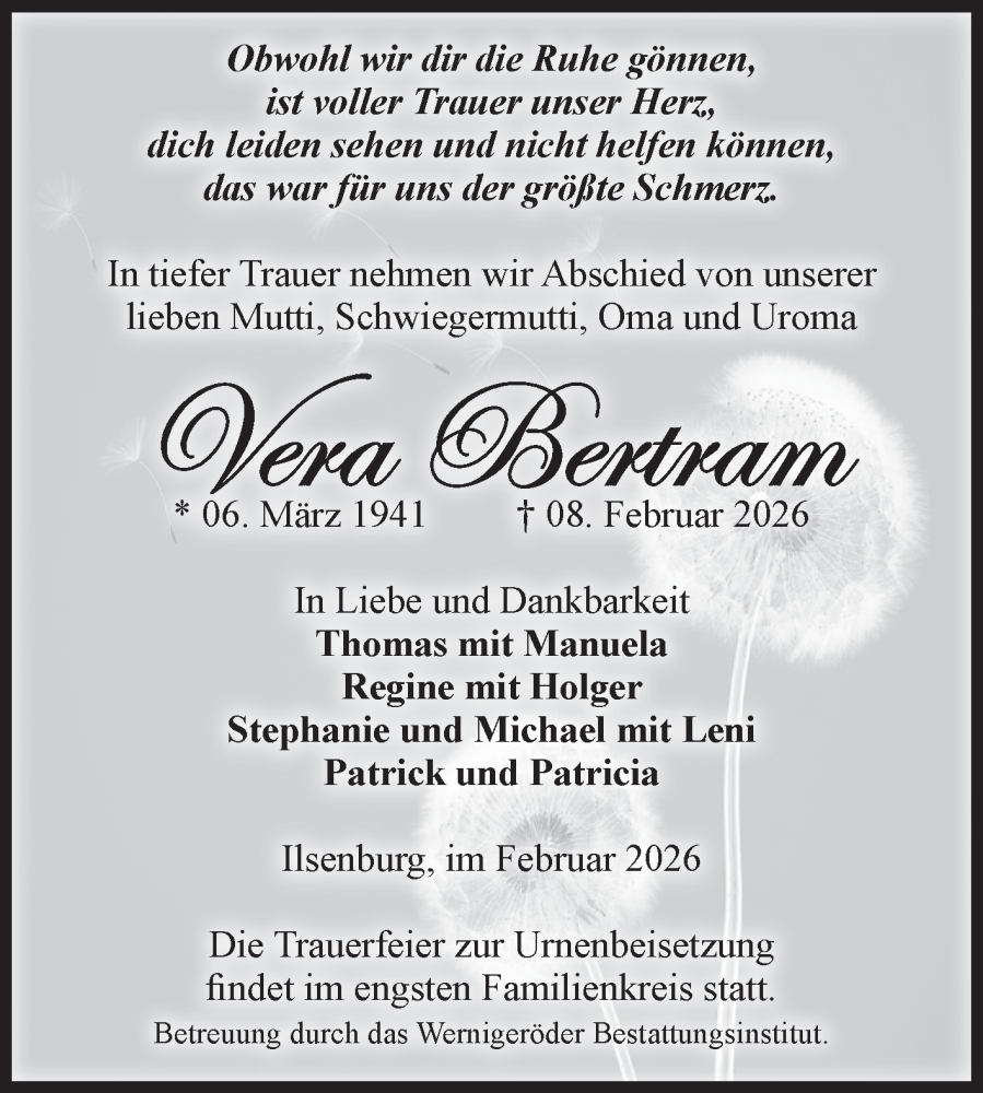 Hier finden Sie alle Traueranzeigen aus der Zeitung, die bisher für Vera Bertram erschienen sind. Weitere Traueranzeigen, die in der Zeitung erscheinen, werden hier ebenfalls aufgelistet