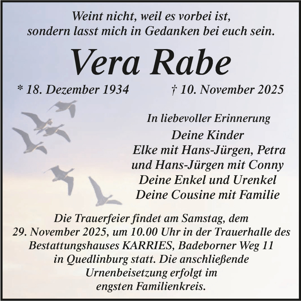 Hier finden Sie alle Traueranzeigen aus der Zeitung, die bisher für Vera Rabe erschienen sind. Weitere Traueranzeigen, die in der Zeitung erscheinen, werden hier ebenfalls aufgelistet