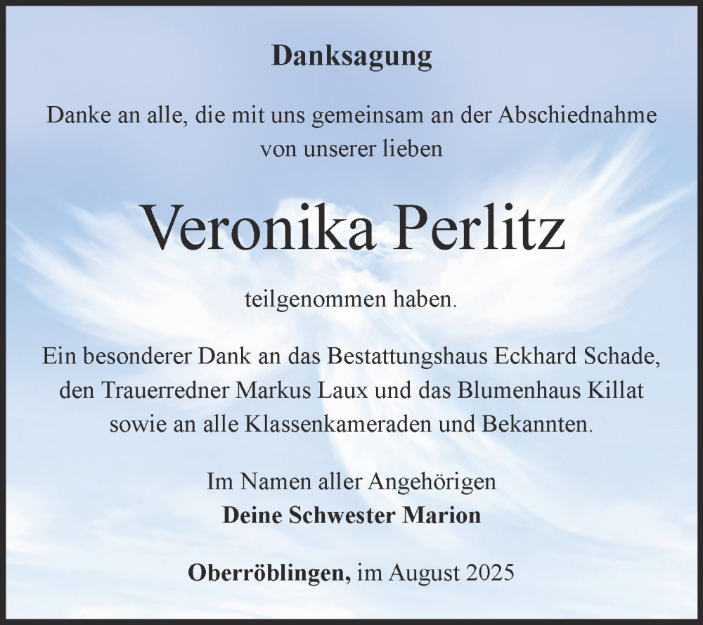 Hier finden Sie alle Traueranzeigen aus der Zeitung, die bisher für Veronika Perlitz erschienen sind. Weitere Traueranzeigen, die in der Zeitung erscheinen, werden hier ebenfalls aufgelistet