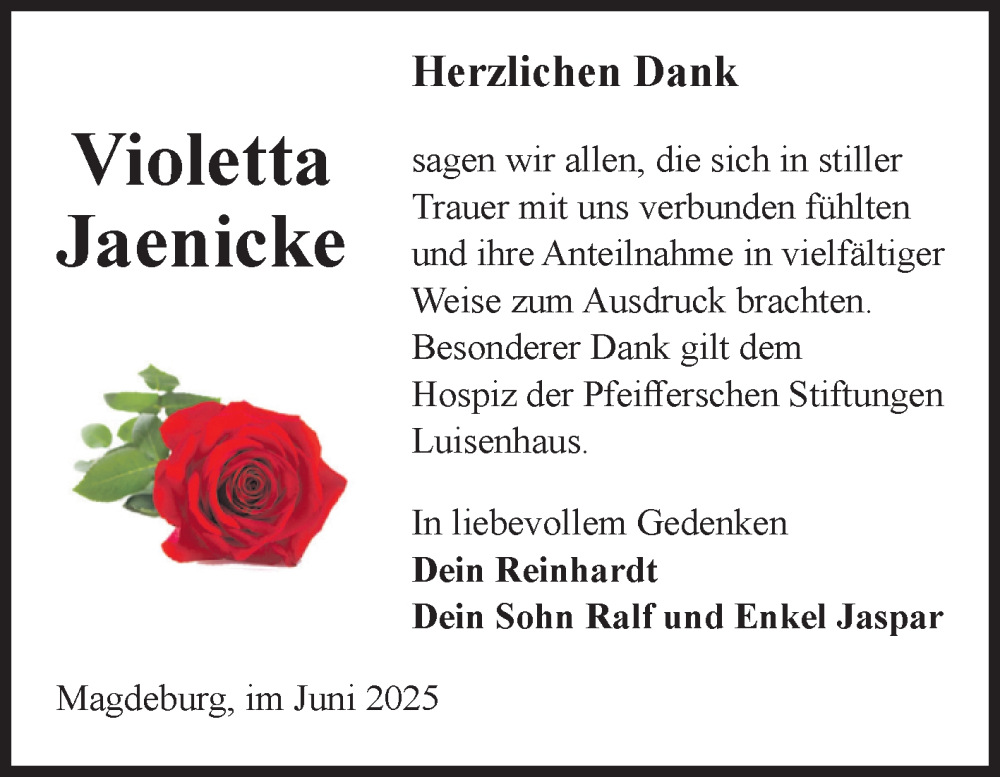 Hier finden Sie alle Traueranzeigen aus der Zeitung, die bisher für Violetta Jaenicke erschienen sind. Weitere Traueranzeigen, die in der Zeitung erscheinen, werden hier ebenfalls aufgelistet