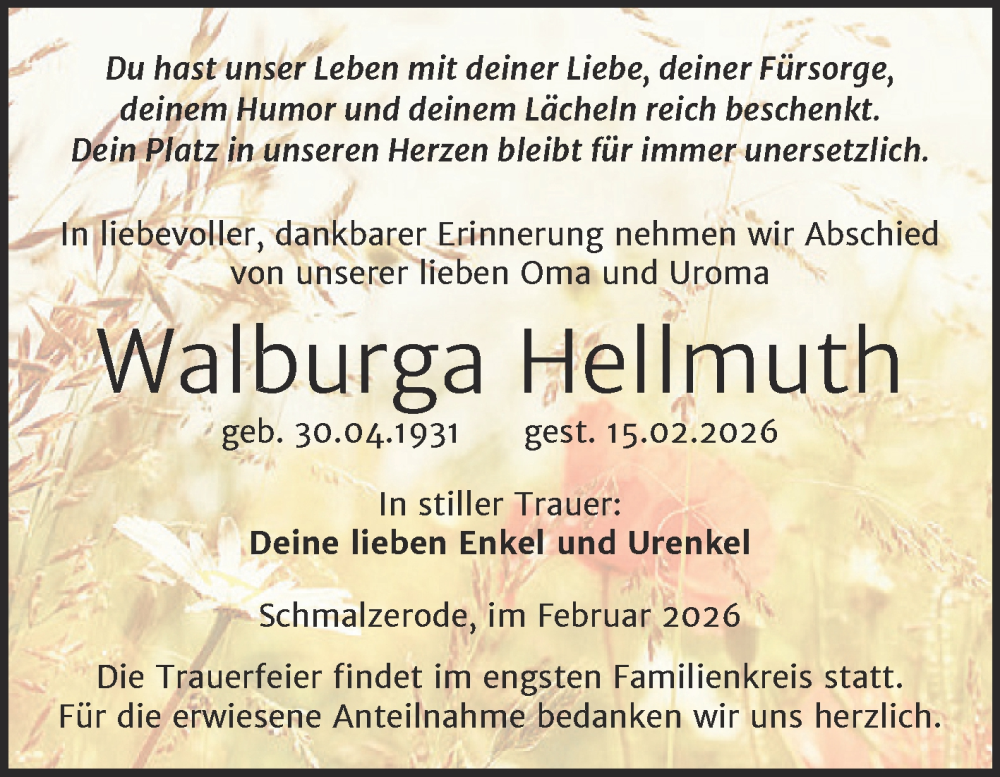 Hier finden Sie alle Traueranzeigen aus der Zeitung, die bisher für Walburga Hellmuth erschienen sind. Weitere Traueranzeigen, die in der Zeitung erscheinen, werden hier ebenfalls aufgelistet
