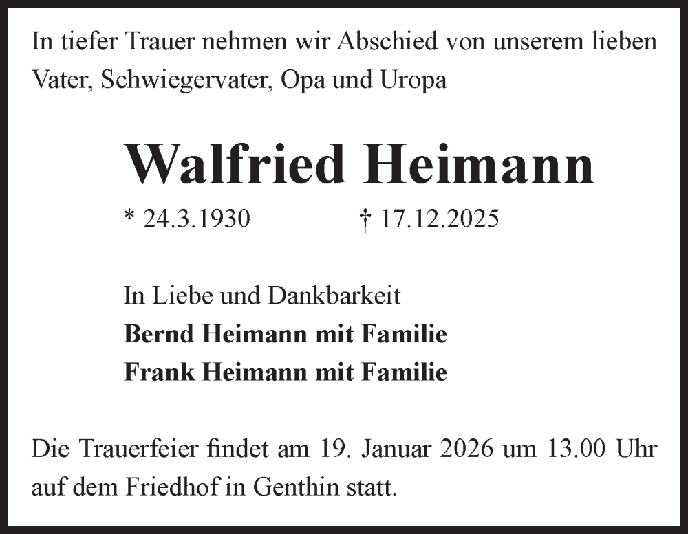 Hier finden Sie alle Traueranzeigen aus der Zeitung, die bisher für Walfried Heimann erschienen sind. Weitere Traueranzeigen, die in der Zeitung erscheinen, werden hier ebenfalls aufgelistet