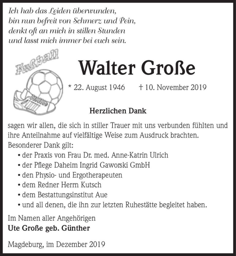 Hier finden Sie alle Traueranzeigen aus der Zeitung, die bisher für Walter Große erschienen sind. Weitere Traueranzeigen, die in der Zeitung erscheinen, werden hier ebenfalls aufgelistet
