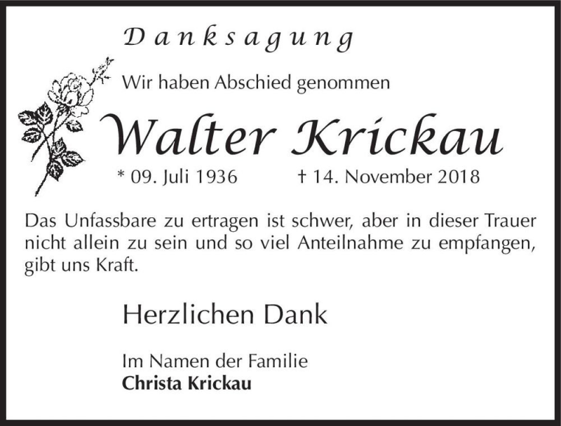 Hier finden Sie alle Traueranzeigen aus der Zeitung, die bisher für Walter Krickau erschienen sind. Weitere Traueranzeigen, die in der Zeitung erscheinen, werden hier ebenfalls aufgelistet