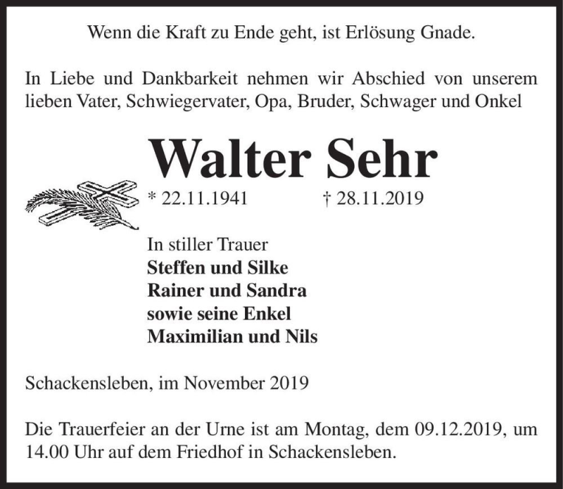 Hier finden Sie alle Traueranzeigen aus der Zeitung, die bisher für Walter Sehr erschienen sind. Weitere Traueranzeigen, die in der Zeitung erscheinen, werden hier ebenfalls aufgelistet