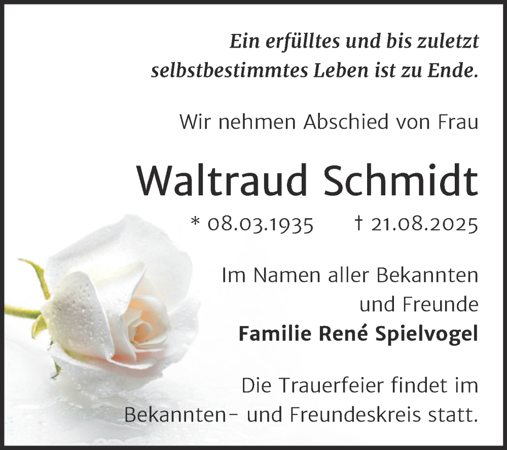 Hier finden Sie alle Traueranzeigen aus der Zeitung, die bisher für Waltraud Schmidt erschienen sind. Weitere Traueranzeigen, die in der Zeitung erscheinen, werden hier ebenfalls aufgelistet