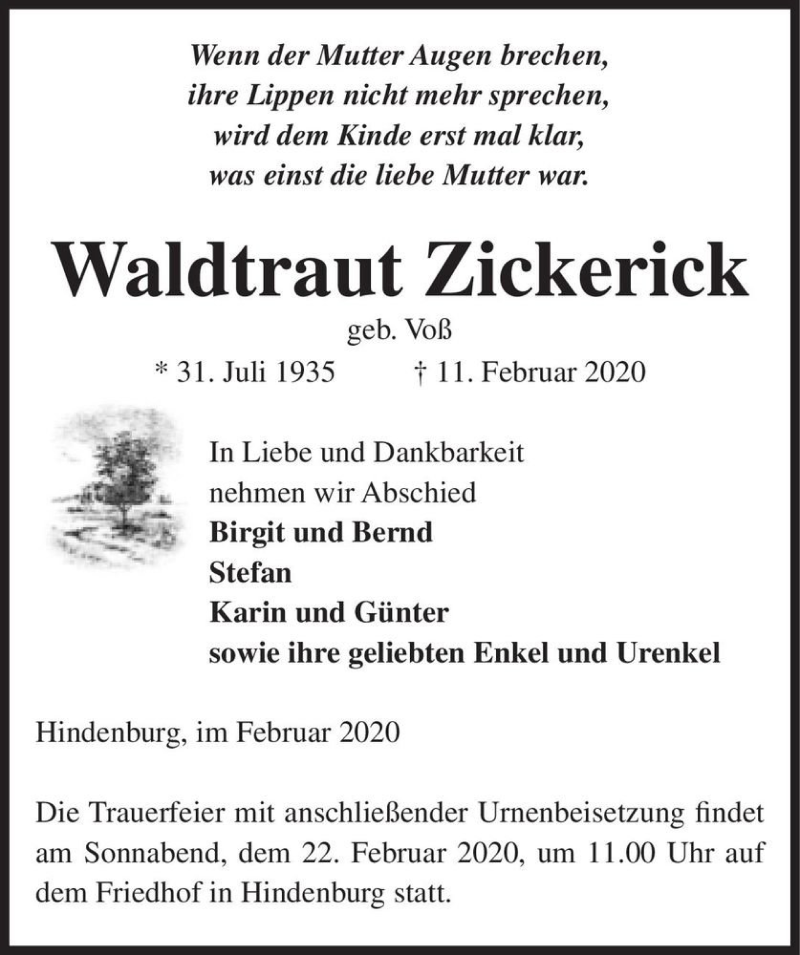 Hier finden Sie alle Traueranzeigen aus der Zeitung, die bisher für Waltraut Zickerick (geb. Voß) erschienen sind. Weitere Traueranzeigen, die in der Zeitung erscheinen, werden hier ebenfalls aufgelistet